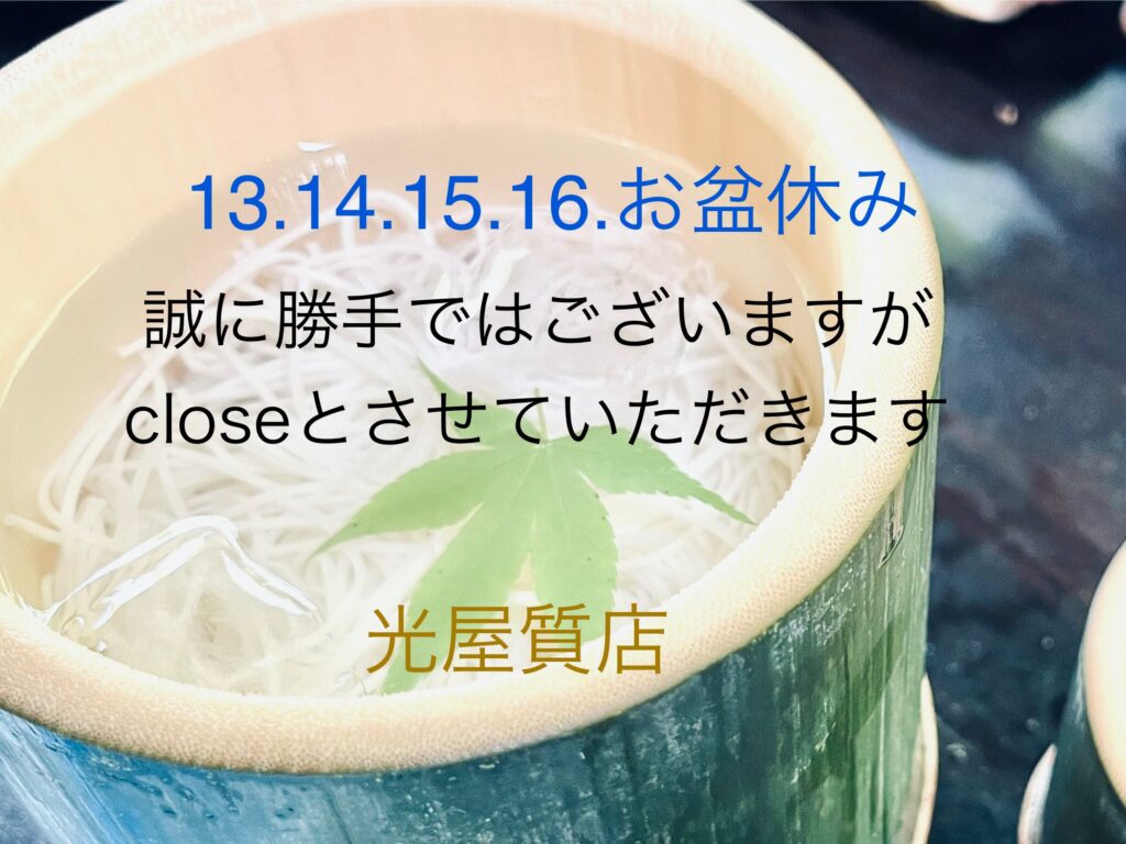 お盆休みのお知らせ 2025年08月7日 尚、17日は日曜日のため定休日となります。18日より通常営業となりますのでよろしくお願いいたします。まだまだ暑さが厳しく体調管理が大変ですが皆様どうぞご自愛くださいませ。 古い記事へ 過去の記事 2025/08/07 お盆休みのお知らせ 2025/05/02 GWの休業お知らせ 2025/03/01 営業時間の変更お知らせ 2025/01/06 2025年1月6日 2025/01/01 2025年 元旦 2024/12/30 2024年ありがとうございました